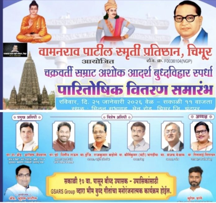 चिमूर :- वामनराव पाटील स्मृती प्रतिष्ठान या संस्थेने चिमूर तालुक्यातील बुद्ध विहारांसाठी चक्रवर्ती सम्राट अशोक आदर्श बुद्ध विहार स्पर्धा आयोजित केली होती.या स्पर्धेतील पारितोषिकप्राप्त बुद्ध विहारांचा पारितोषिक वितरण समारंभ राज्याचे विधी व न्याय राज्यमंत्री ऍड.आशिष जैस्वाल यांचे विशेष उपस्थितीत आज 25 जानेवारीला आयोजित करण्यात आला आहे.
