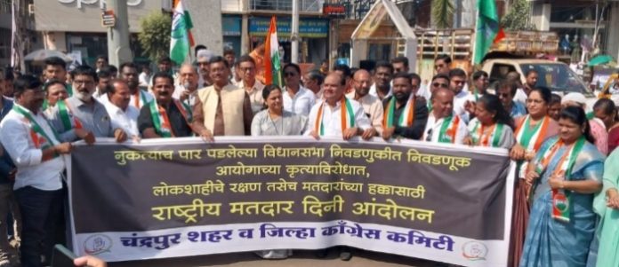 चंद्रपूर :- नुकत्याच पार पडलेल्या विधानसभा निवडणुकीत निवडणूक आयोगाच्या कार्यप्रणाली विरोधात तसेच लोकशाहीचे रक्षण आणि मतदारांच्या हक्कांसाठी चंद्रपूर जिल्हा व शहर काँग्रेस कमिटीच्यावतीने गांधी चौक येथे 25 जानेवारी 2025 रोजी सकाळी 10.30 वाजता आंदोलन करण्यात आले.