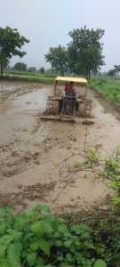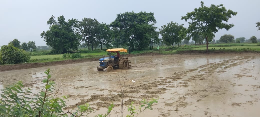 भात रोपांची लागवड करण्यासाठी बांध्यामध्ये चिखलटी (गढण) करणे आवश्यक असते.यामुळे शेतकऱ्यांनी ट्रॅक्टर द्वारे भात पिकांच्या शेतामध्ये चिखलटी करणे सुरु केले आहे.