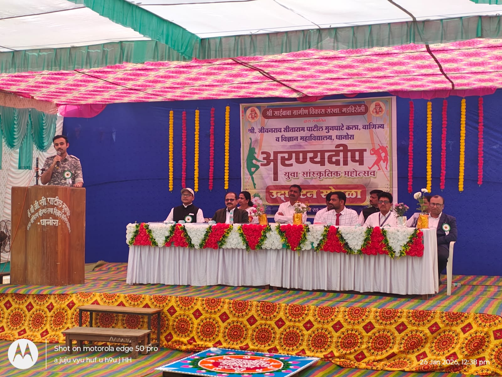 युवकांच्या ऊर्जेला आणि ग्रामीण संस्कृतीच्या जिवंत परंपरेला व्यासपीठ देणारा आरण्यदिप युवा सांस्कृतिक महोत्सव दिनांक २६ जानेवारी २०२६ रोजी जीवनराव सीताराम पाटील मुनघाटे महाविद्यालय, धानोरा येथे थाटामाटात पार पडला. प्रजासत्ताक दिनाच्या पार्श्वभूमीवर झालेल्या या महोत्सवाच्या उद्घाटनाने संपूर्ण महाविद्यालय व धानोरा परिसर सांस्कृतिक जल्लोषाने दुमदुमून गेला.