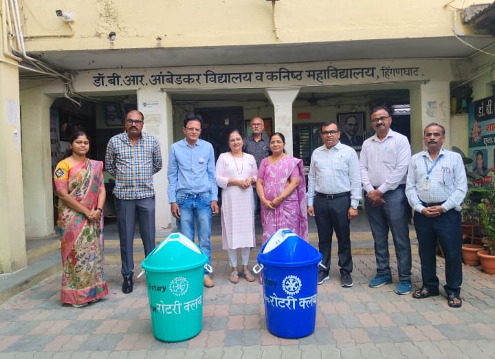 हिंगणघाट :- पृथ्वी दिवस के अवसर पर 22 अप्रैल को रोटरी क्लब हींगणघाट द्वारा बुधवार सुबह 9:30 बजे डाॅ.बाबासाहेब आंबेडकर स्कूल,हींगणघाट में विशेष डस्टबिन वितरण का कार्यक्रम आयोजित किया गया था।
