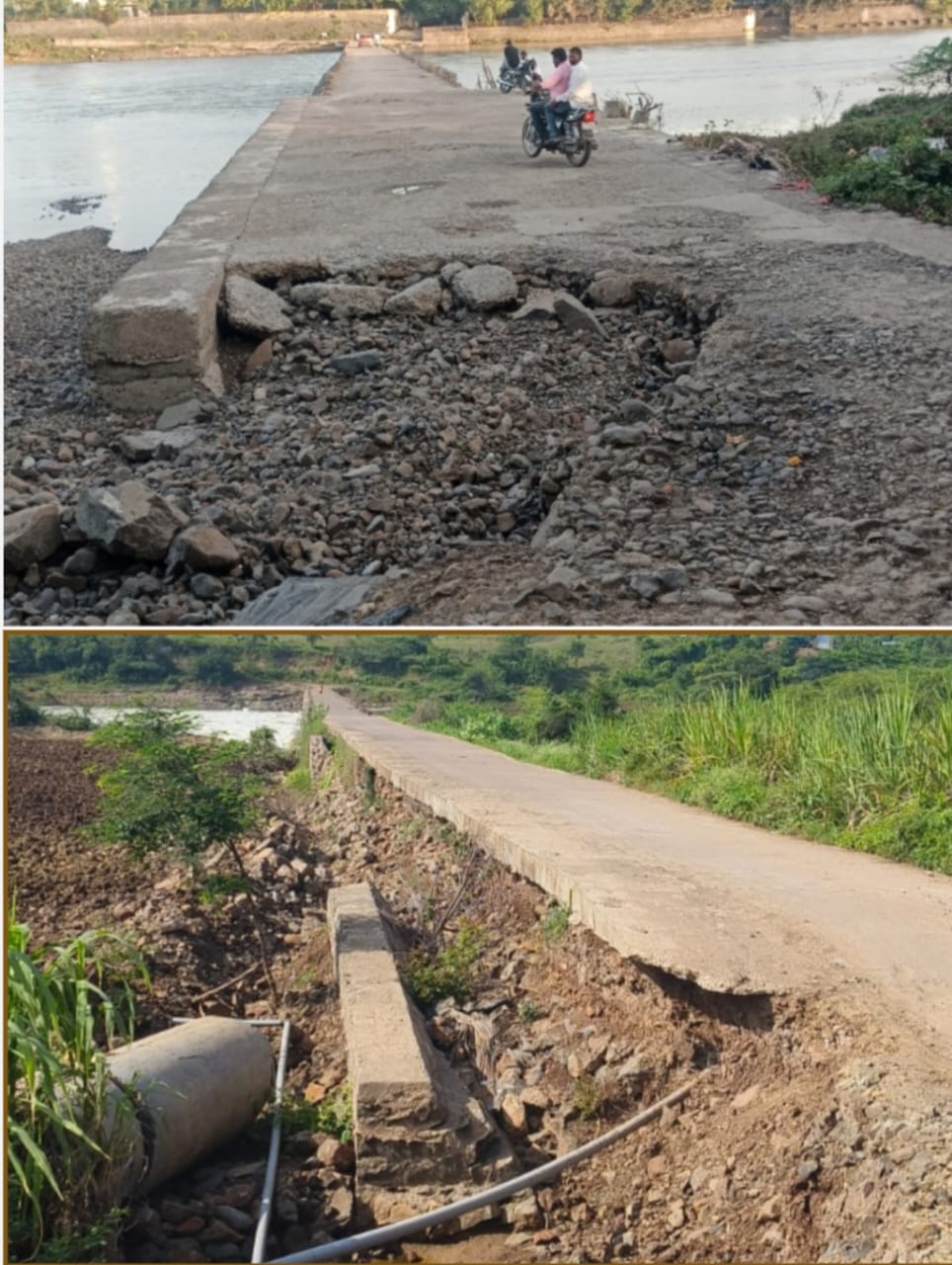 पावसामुळे नदीला आलेला पूर व पुराच्या पाण्याने खचून गेलेला बंधाऱ्याचा भाग पूर्णपणे जलमय झाला आहे. यामुळे वाहन चालकांना जीव मुठीत घेऊन प्रवास करावा लागत आहे.