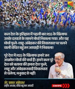 शेवटी महाराष्ट्र पोलीसांना प्रश्न आहे की,महाराष्ट्र पोलिस वंचित पदाधिकाऱ्यांवर विना परवानगी मोर्चा काढला म्हणून कारवाई करणार असतील तर मग बोगस संघटना अंतर्गत आर.एस.एस.च्या सर्व प्रमुखांवर व पदाधिकाऱ्यांवर आणि त्यांना संरक्षण देणाऱ्या पोलिस अधिकाऱ्यांवर कारवाई करण्याबाबत केव्हा समोर याल?
