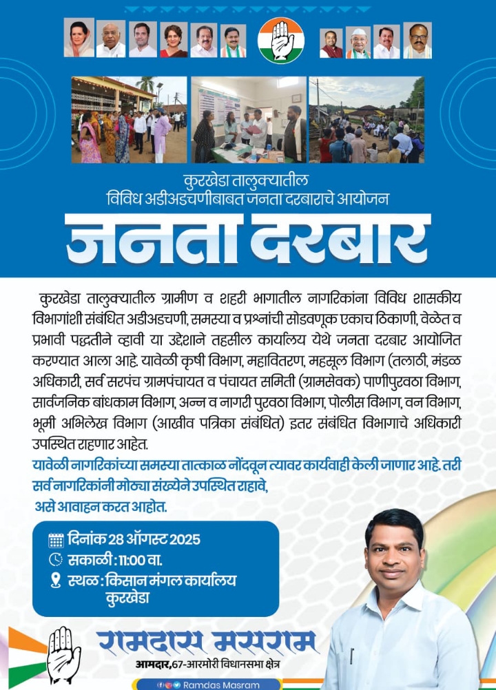 कुरखेडा तालुकातंर्गत ग्रामीण व शहरी भागातील नागरिकांना विविध शासकीय विभागांशी संबंधित अडीअडचणी,समस्या व प्रश्नांची सोडवणूक एकाच ठिकाणी,वेळेत व प्रभावी पद्धतीने व्हावी या उद्देशाने तहसील कार्यालय येथे जनता दरबार आयोजित करण्यात आला आहे.
