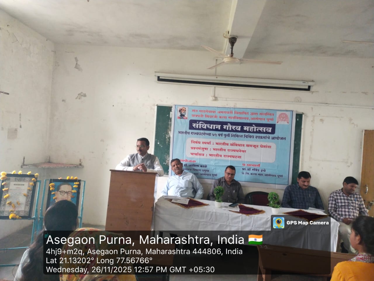 छत्रपती शिवाजी कला महाविद्यालय आसेगाव पूर्णा येथे राज्यशास्त्र विभाग व राष्ट्रीय सेवा योजना यांच्या संयुक्त विद्यमाने संविधान दिन मोठ्या उत्साहात साजरा करण्यात आला.
