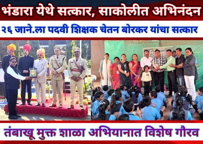 महाराष्ट्र राज्य शिक्षण विभाग, आरोग्य विभाग तसेच राष्ट्रीय तंबाखू नियंत्रण कार्यक्रम तथा सलाम मुंबई फाउंडेशनच्या संयुक्त विद्यमाने साकोली जि. प. उच्च. प्राथ. शाळा साकोली १ येथील शिक्षक चेतन बोरकर यांना २६ जानेवारी गणराज्य दिनानिमित्त भंडारा जिल्हा पालकमंत्री व वस्त्रोद्योगमंत्री संजय सावकारे, जिल्हाधिकारी डॉ. संजय कोलते, जिल्हा पोलीस अधिक्षक नुरुल हसन, मुख्य कार्यकारी अधिकारी समिर कुर्तकोटी यांच्या हस्ते सन्मानचिन्ह देऊन गौरव करण्यात आला.