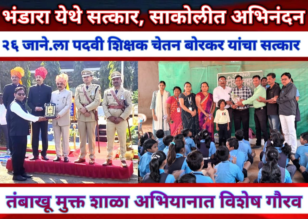साकोली :- शिक्षणाधिकारी रविंद्र सोनटक्के यांच्या मार्गदर्शनाखाली “तंबाखू मुक्त शाळा अभियान” अंतर्गत तंबाखू मुक्ती साठी शाळा व विद्यार्थीच नव्हे तर समाजातील व्यसनाधीन व्यक्तींना व्यसनापासून मुक्त करण्यासाठी केलेल्या उत्कृष्ट कार्याबद्दल २६ जानेवारीला प्रजासत्ताक दिनी भंडारा येथे पोलीस मैदानावर अतिथींच्या हस्ते जि. प. केंद्र उच्च प्राथ. शाळा क्र. १ साकोली येथील पदवीधर शिक्षक चेतन बोरकर यांचा सत्कार करण्यात आला. तसेच साकोली शालेय स्तरावर सुद्धा त्यांचे पालक, शाळा व्यवस्थापन समितीतर्फे अभिनंदन करण्यात आले.