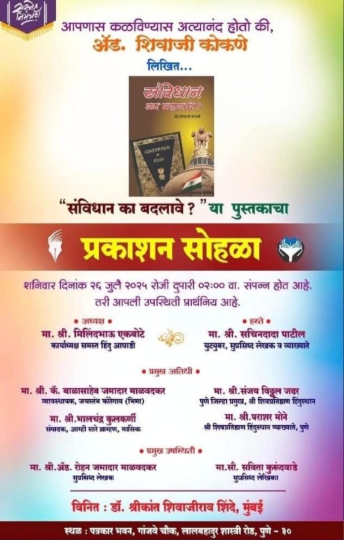 अँड.शिवाजी कोकणे लिखित,”संविधान का बदलावे?या पुस्तकाचा प्रकाशन सोहळा डॉ.श्रिकांत शिवाजीराव शिंदे (मुंबई) यांनी दिनांक २६ जुलै २०२५ रोज शनिवारला पुणे येथील पत्रकार भवन,गांजवे चौक,लालबाहादूर शास्त्री पुणे रोड -३० येथे विनापरवानगी आयोजित केला होता.