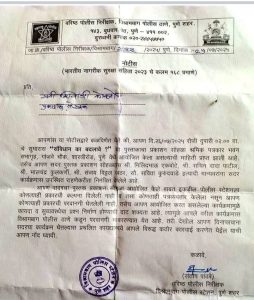 विश्रामबाग पोलिस ठाणे पुणे शहर चे वरिष्ठ पोलिस निरीक्षक संतोष पांढरे यांनी अशा कार्यक्रमांचे आयोजन करण्याची परवानगी घेतली नाही म्हणून दिनांक २५ जुलै २०२५ रोज शुक्रवारला भारतीय नागरि सुरक्षा संहिता २०२३ चे कलम १६८ प्रमाणे अँड.शिवाजी कोकणे यांना नोटीस दिली होती.