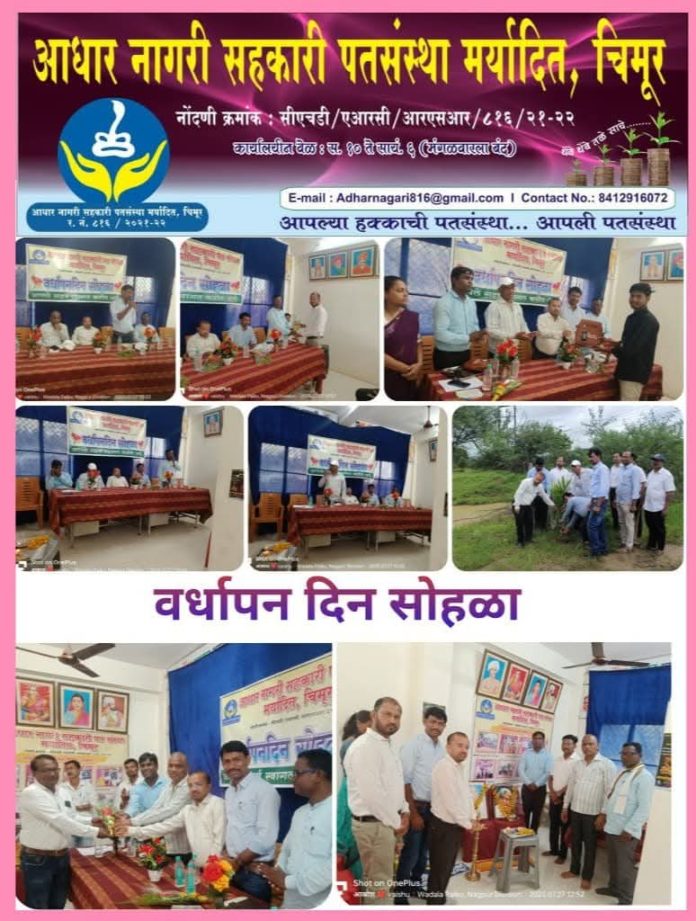 चिमूर येथील आधार नागरी सहकारी पतसंस्था मर्या. चिमूर र. न. ८१६च्या स्थापनेला चार वर्ष यशस्वी पणे पूर्ण होऊन दिनांक २७ जुलै ला वर्धापन दिन विविध उपक्रम द्वारे साजरा करण्यात आला. समाजातील सर्वसामान्य वर्गाला नावा प्रमाणे आधार देणारी पतसंस्था असून भविष्यात ही पत संस्था उंच भरारी घेईल असे मत प्रमुख अतिथी सामाजिक कार्यकर्ते अरविंद सांदेकर यांनी वर्धापन दिन कार्यक्रम प्रसंगी व्यक्त करीत शुभेच्छा दिल्या.
