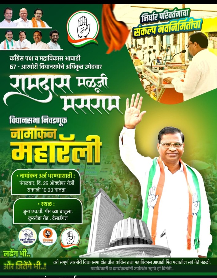 नानाभाऊ पटोले प्रदेशाध्यक्ष, काँग्रेस कमिटी महाराष्ट्र राज्य,नामदार विजयभाऊ वडेट्टीवार विरोधी पक्षनेते महाराष्ट्र ,खासदार डॉ.नामदेवराव किरसान, अभिजीतदादा वंजारी, विधानपरिषद सदस्य (पदवीधर आमदार), श्री.सुधाकरजी अडबाले विधान परिषद सदस्य (शिक्षक आमदार), श्री. महेन्द्रभाऊ ब्राह्मणवाडे जिल्हाध्यक्ष काँ क.गडचिरोली व सर्व महाविकास आघाडीचे जिल्हाध्यक्ष, तालुकाध्यक्ष, पदाधिकारी व कार्यकर्ते यांचे प्रमुख उपस्थितीमध्ये भा.रा.कांग्रेस, शिवसेना (उबाठा) राष्ट्रवादी काँग्रेस (शरद पवार) व महाविकास आघाडीचे अधिकृत उमेदवार सर्वांचे लाडके श्री.रामदास मळूजी मसराम यांचे नामांकन अर्ज दाखल करण्यासाठी सर्व महाविकास आघाडीचे व इंडिया आघाडीचे नेते मंडळी,पदाधिकारी व कार्यकर्ते यांनी उपस्थित राहण्याचे आवाहन करण्यात आले आहे..