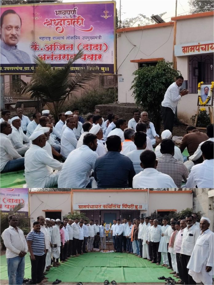 पिंपरी बुद्रुक तालुका इंदापूर येथील सर्व ग्रामस्थ व ग्रामपंचायत यांच्या वतीने ग्रामपंचायत कार्यालयास समोर उपमुख्यमंत्री अजित दादा पवार यांना भावपूर्ण श्रद्धांजली अर्पण करण्यात आली.