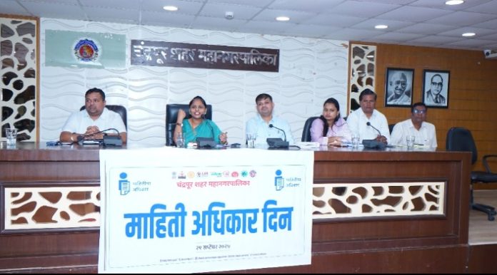 चंद्रपूर महानगरपालिकेतर्फे माहिती अधिकार दिन 29 सप्टेंबर रोजी उत्साहात साजरा करण्यात आला. महाराष्ट्र शासनातर्फे 28 सप्टेंबर हा दिवस माहिती अधिकार दिन म्हणून साजरा करण्यात येतो मात्र यादिवशी शासकीय सुट्टी असल्याने सोमवार 29 सप्टेंबर रोजी हा दिवस साजरा करण्याचे शासन निर्देश होते.