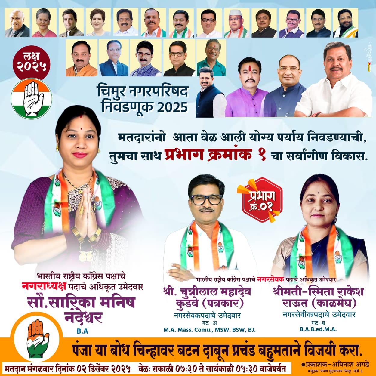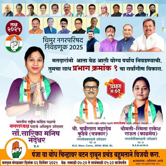 चिमूर नगर परिषदेच्या सार्वत्रिक निवडणुकीच्या पार्श्वभूमीवर भारतीय राष्ट्रीय काँग्रेस पक्षाने प्रभाग क्रमांक १ साठी विकासाचा मसुदा जाहीर केला असून,नागरिकांच्या अपेक्षांना प्राधान्य देत मुलभूत सुविधा,स्वच्छता,हरित पर्यावरण,शिक्षण,महिला सक्षमीकरण आणि पारदर्शक प्रशासन यांचा एकात्मिक आराखडा यात मांडण्यात आला आहे.