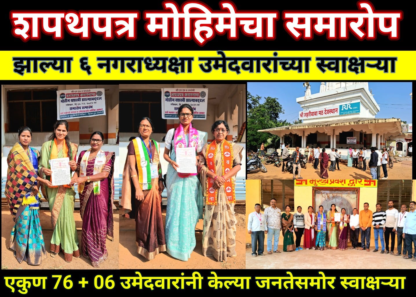 अख्ख्या महाराष्ट्रात जागोजागी प्रसिद्ध झालेली “शपथपत्र करारनामा” समारोप समारंभात नगराध्यक्षा पदातील उमेदवार भारती मोहन लंजे, वंदना गुलाब पोहाणे, सुनिता अशोक कापगते, वर्षा निताराम तरजूले, देवश्री मनिष कापगते व कोकीळा सचिन रामटेके या सहा महिलांनी येथे येऊन उत्स्फूर्त सहभाग घेतला व जनतेच्या शपथपत्र करारनामा वर स्वाक्षऱ्या केल्यात.