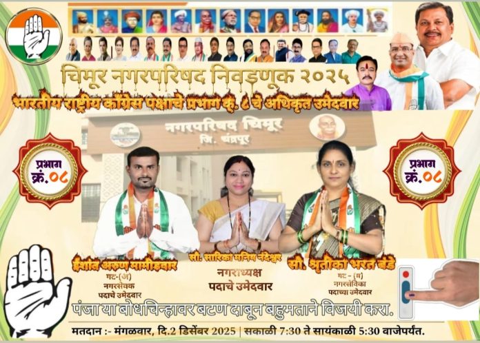 चिमूर नगर परिषदेच्या सार्वत्रिक निवडणुकीच्या पार्श्वभूमीवर भारतीय राष्ट्रीय काँग्रेस पक्षाने प्रभाग क्रमांक 8 साठी विकासाचा मसुदा जाहीर केला असून, नागरिकांच्या अपेक्षांना प्राधान्य देत मुलभूत सुविधा, स्वच्छता, हरित पर्यावरण, शिक्षण, महिला सक्षमीकरण आणि पारदर्शक प्रशासन यांचा एकात्मिक आराखडा यात मांडण्यात आला असता दरम्यान प्रभाग क्रमाक – 8 मधील उमेदवार ईशांत अरुण मामीडवार व सौ श्रुतिका भरत बंडे व नगराध्यक्ष पदाच्या उमेदवार यांनी प्रचारात मुसंडी मारली आहे.