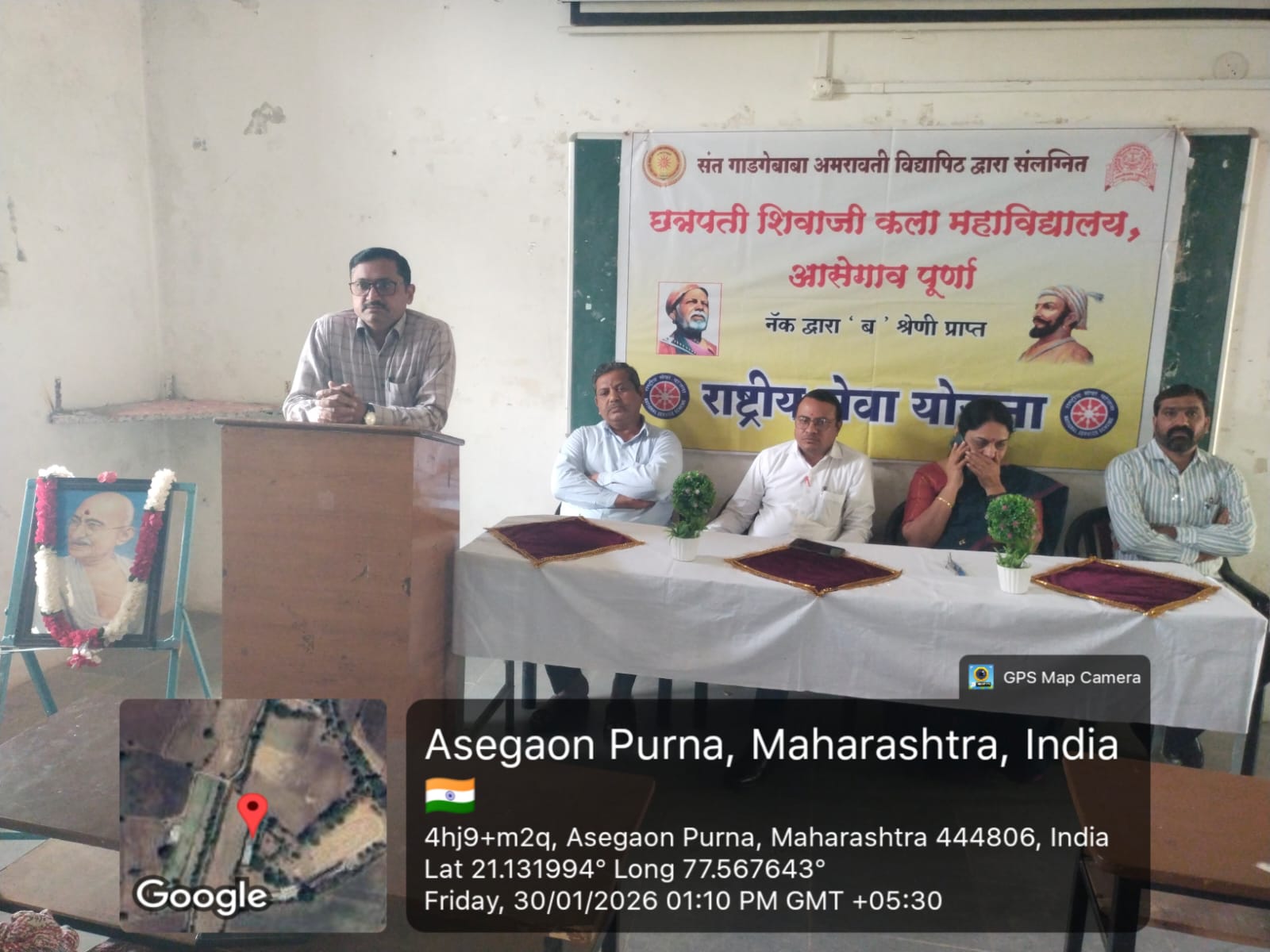खल्लार :- छत्रपती शिवाजी कला महाविद्यालय आसेगाव पूर्णा येथे राष्ट्रीय सेवा योजना पथकाच्या वतीने राष्ट्रपिता महात्मा गांधी यांची 78 वी पुण्यतिथी निमित्य संपन्न झाली.